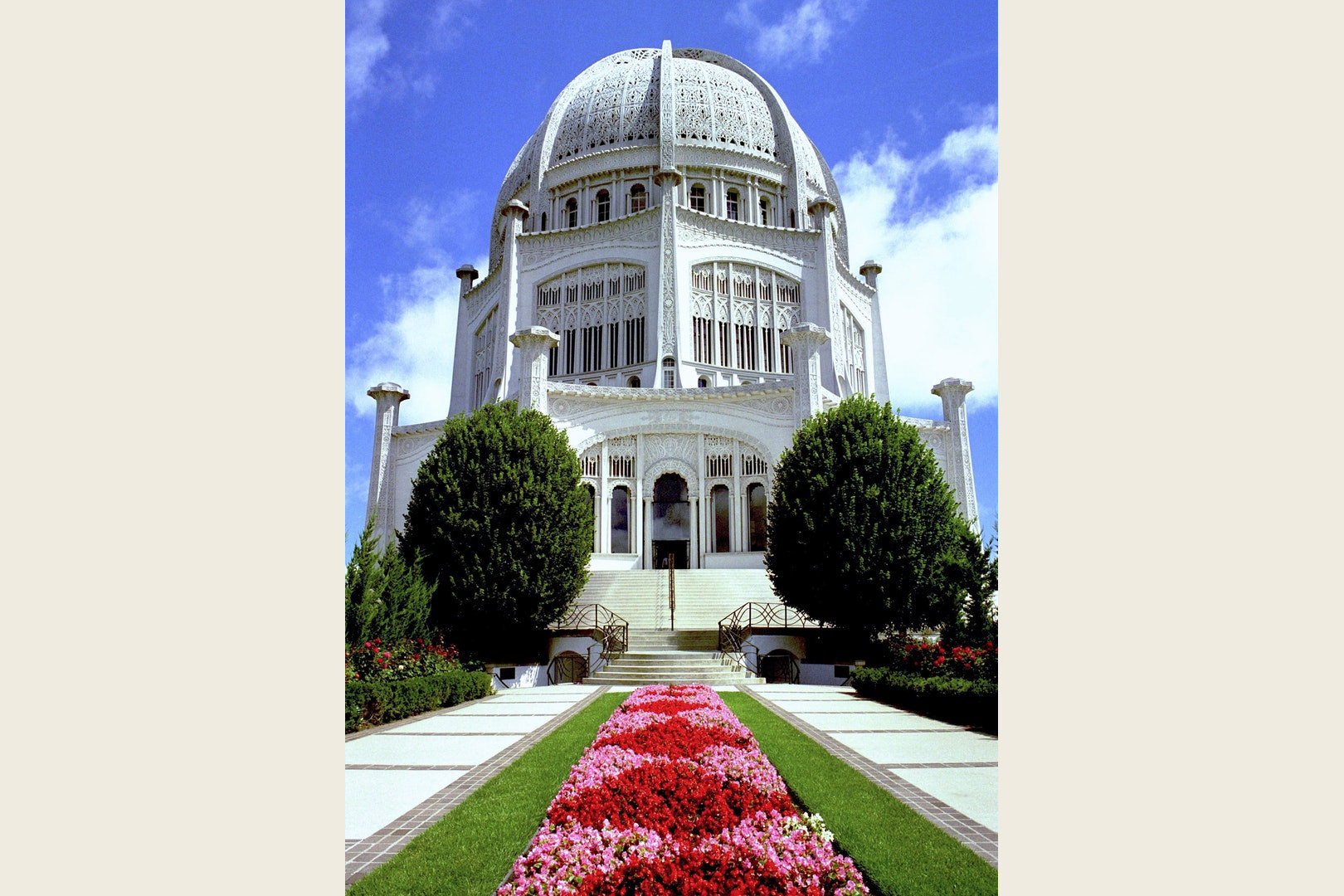Like placeholders thoughtfully located on the five continents of the world, the six Bahá’í temples stand like beacons into a future where the nations of the world will have recognized the ties that bind them and replaced division and rivalry with unity. All of these temples are nine-sided with entries on each of the nine sides. Bahá’ís see these entrances as symbols of the welcoming attitude toward all the peoples of the Major Religions of the world destined in the future to acknowledge their fundamental similarities and abandon the religious rivalry and enmity that have hitherto been the cause of so much strife, bloodshed, and division on earth.